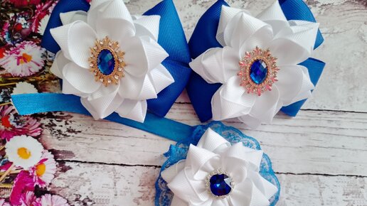 Мне на днях заказали набор, состоящий из резиночек и браслетика. Прислали платье, оно было бело-синее. Соответственно и набор, я сделаю таким. Для работы нам потребуется: Приступим к изготовлению резинок. Все размеры указываю на одну резинку. Для начала нарежем репсовую ленту шириной 3,8 см на 2 отрезка длиной 20см. Опалим края и сделаем обычный бантик, посмотрите, как это делаю я: Далее, мы с вами сделаем сам цветочек. Для этого возьмем ленту шириной 2,5см и нарежем на отрезки: Теперь опалим края, и начнем сшивать, как показано на фото...