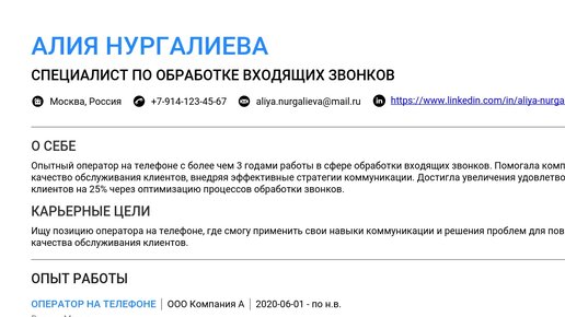 Ищете пример резюме оператора на телефоне (входящие звонки)? Изучение готовых примеров – ключевой шаг к составлению эффективного резюме, которое поможет вам получить желаемую работу. В этом подробном руководстве мы собрали все необходимое для создания сильного резюме: Изучив пример, вы сможете создать резюме с помощью нашего конструктора резюме. 🚀 Заголовок резюме должен быть четким, понятным и отражать вашу специализацию. Для профессии "оператор на телефоне (входящие звонки)" важно указать уровень профессионализма и ключевые навыки...