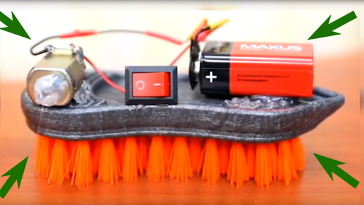 Для этого робота нам понадобится : 1) Моторчик; 2) Гайка; 3) Включатель или кнопка; 4) Батарейка Крона; 5) Клей- пистолет , или просто супер клей; 6) Щётка; 7) Паяльник. Приступим: 1. Возьмём моторчик и прикрепим к его валу маленькую гайку, что бы создать сильную вибрацию . Показано на рисунке ниже. 2. Возьмём паяльник и при помощи него присоединим 2 проводка один к плюсу другой к минусу. 3. Соединим их с батарейкой Крона, через выключатель. Должна получится вот такая конструкция...