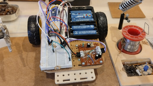 Уже с начала лета 2023 появилась заготовка для этого проекта. В дальнейшем планируется усовершенствование базы и замена деталей, вырезанных вручную, на 3D печать и фрезерование. На данный момент: Пока что все его элементы соединены с помощью проводов и BreadBoard'а. Не самый практичный вариант, но на этапе разработки и усовершенствования подходит. Основа Основу я сделал из ДВП: что под рукой было (а именно ДВП, шуруповёрт и электролобзик), из того и слепил)) Конечно, в идеале основа должна быть из 5-миллиметровой фанеры и вырезана ЧПУ фрезером...