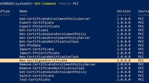 Доброго времени суток! Сегодня расскажем вам о том, как сделать самоподписанный SSL сертификат безопасности в Windows при помощи PowerShell. ! Запускать PShell нужно от имени администратора ! Такие сертификаты используются в тестовых целях и для обеспечения сертификации внутренних служб). Для создания сертификата понадобится использовать командлет New-SelfSignedCertificate, который входит в состав модуля PKI. Выводим список всех доступных командлетов, командой: