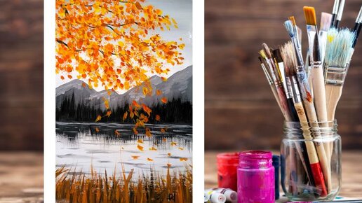 Добрый день! Сегодня мы рисуем гуашью контрастный осенний пейзаж. Для этого вам понадобятся следующие материалы: Прикрепите лист бумаги скотчем к поверхности стола или планшету. Покройте весь лист белилами, используя широкую плоскую кисть. Смело выходите на скотч и прокрашивайте стыки. Сразу, после того, как вы сделаете белую основу, поставьте несколько точек чёрным цветом сверху и снизу. После чего, набрав на ту же широкую плоскую кисть белила, растяните черный цвет снизу вверх и сверху вниз по ширине листа...