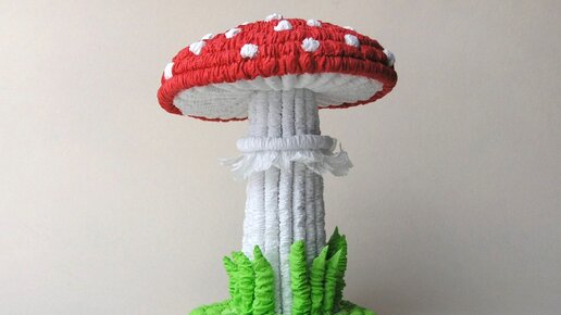 В шляпе красной, вид победный, а характер очень вредный. Мухомор сделан из гофротрубочек. Как скручивать гофротрубочки, можно посмотреть здесь. Понадобится 8 красных, 14 белых и 2 зелёные гофротрубочки. Ещё нужно 3 листа газеты размером А4, картон для подставки и 3 салфетки. Из одного газетного листа сделаем ножку гриба. Обернём ножку салфетками и подклеим края. Сделаем шляпку - газетный лист скомкаем в шарик, обернём сверху другим листом газеты, подвернём и подклеим края. Завернём шляпку в салфетки, зафиксируем клеем...