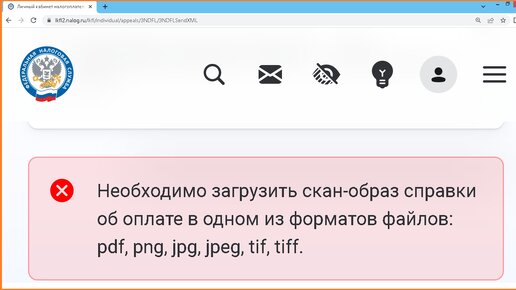 Ошибка «Необходимо загрузить скан-образ справки об оплате в одном из форматов файлов: pdf, png, jpg, jpeg, tif, tiff» возникает в личном кабинете налогоплательщика при загрузке декларации 3-НДФЛ за 2025 год, в которой присутствуют социальные вычеты для которых нужна справка об оплате услуг в формате xml (название файла начинается UT_). Формат файлов при этом сделан нужный, то есть именно тот, на который предлагают заменить в сообщении об ошибке. Размер файлов также не превышает необходимый размер...