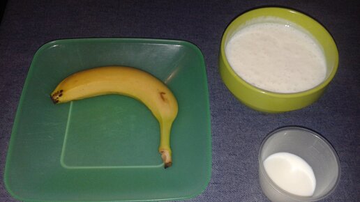 Понадобится спелый банан (лучше будет, если он будет мягким, что-бы размять мельче), 300 мл кефира (любого) это с учетом на одну порцию и 50 мл молока (что-бы лучше взбивалось) Сначала очищаем банан от кожуры...