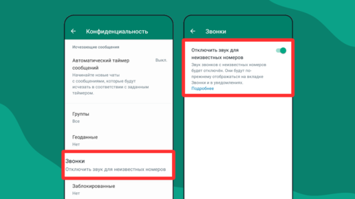 В WhatsApp нельзя ограничить поступление таких звонков на свой номер, но последнее обновление позволит делать такие звонки беззвучными. Как сделать звонки в WhatsApp беззвучными? Нужно зайти в настройки приложения WhatsApp, перейти во вкладку «Конфиденциальность» и «Звонки»...
