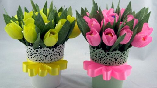 Как сделать сладкий букет нежно-розовых тюльпанов из гофрированной бумаги с конфетами внутри