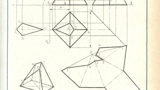Порядок выполнения работы 1. В правом верхнем углу формата А3 провести оси проекций. Начертить три вида пирамиды по размерам d и h. 2. На главном виде отложить от центра основания пирамиды размер m и получить точку Px. Через точку Px провести секущую плоскость под углом α. 3. Секущая плоскость пересекает ребра пирамиды в точках 1', 2', 3', 4'. Найти эти точке на двух оставшихся видах: - из т. 1' и т. 3' опустить вертикальные проецирующие линии на соответствующие ребра на виде сверху и найти т. 1 и т...