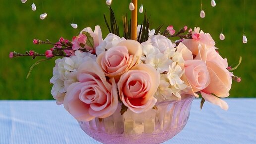 Цветы в доме – это всегда прекрасно, а особенно если они украшают помещение по случаю торжества, да еще и в необычных вазах. Такая уникальная вещь станет стильным элементом декора вашего дома и уж точно будет привлекать внимание всех гостей. Давайте начнем. Материалы необходимые для этого проекта: чаша; кубик пены; зонтик; персиковые розы; маленькие кремовые головки гортензии; фуксия; розовая маленькая кустовая роза; белая маленькая кустовая роза; стебли вишнёвый цвет; трава рафии; жемчужные бусы-капли,слёзы; рыболовная леска...
