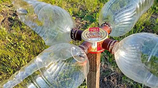 Жимолость поспела на даче и птицы "стадами" стали прилетать полакомиться вкусной ягодкой , чтобы хоть что то осталось и для меня решил построить так называемый "ветряк " отпугивающий  птиц  , или если сказать по простому - вертушку .   Вертушку надо делать не просто крутящуюся от ветра но и чтобы эта вертушка издавала какие то звуки , решил делать скрипучую )  Для того чтобы изготовить ветряк нам понадобится металлическая банка консервная , четыре пластиковые бутылки ( я применил трёхлитровые ) , гайка , четыре самореза по металлу , крышку от банок ( можно пластиковую ) и гвоздь ...