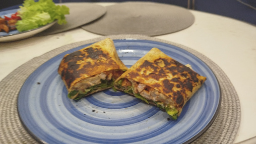 - На лаваш выложи **обжаренную курицу** 🍗 — она должна быть ароматной и слегка подрумяненной.