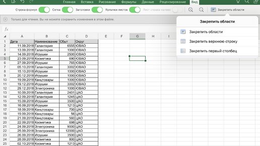 Закрепить можно выбранную область, первую строку или первый столбец.