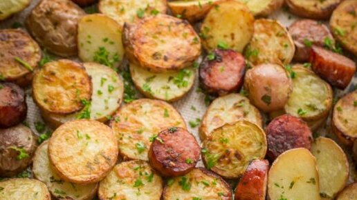 Ультра хрустящий и ароматный . Легкая идея ужина. Самый простой способ нет необходимости чистить картофель, и это рецепт картофеля с быстрой и легкой подготовкой. Как сделать Запеченный, картофель с колбасой в духовке Разогрейте духовку до 200 С. Берём большой противень с пергаментной бумагой. 1 Картофель нарезать кольцами толщиной не более 1 см. Если картофель мелкий , можно на половину или четверть , так что они не больше. Нарежьте колбасу на более толстые кольца. Поместите картофель и колбасу в большую миску...