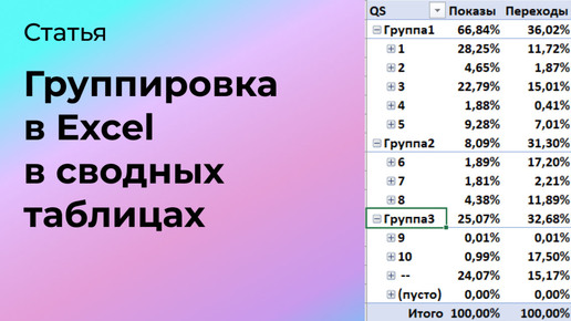 Функция “Группировка по выделенному” в сводных таблицах Excel позволяет объединить несколько строк или столбцов в сводной таблице в одну группу. В основе – выделенный вручную диапазон ячеек. Вместо того, чтобы вручную выбирать каждый элемент для группировки (например, по дате, диапазону чисел или категориям), вы просто выделяете нужные строки или столбцы, а затем используете команду “Группировка по выделенному”. Excel автоматически создает новую группу, суммируя или агрегируя данные из выделенных ячеек...