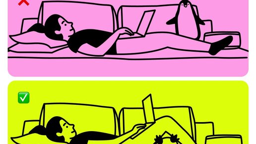 Работать за компьютером можно сидя, лежа, полулежа или стоя. В каких-то позах мышцы напрягаются, и спина устает быстрее. Но если менять положение и разминаться в среднем каждые 30 минут, работа на диване не повредит. В бесплатном курсе «Как сидеть за компом» рассказываем, как часто делать перерывы, какие движения помогут вашей спине чувствовать себя здоровее и как улучшить положения лежа и сидя на диване. Лежа на спине ❗️ Основная зона напряжения в этом положении — шея. ✅ Подложите под голову и шею подушку...
