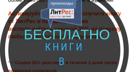 Литрес позволяет бесплатно скачать электронные книги и/или аудиокниги по промокодам (купонам). Банковская карта не требуется. Для получения электронных книг войдите под своим логином/паролем в магазин Литрес или зарегистрируйтесь заново. Примените промокод и получите возможность бесплатно скачать выбранные электронные книги в форматах epub, fb2, fb3, mobi, pdf, rtf, html, txt или аудиокниги в форматах mp3, m4b...