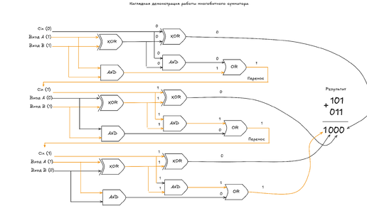 Мы уже познакомились с полусумматором, который складывал два бита, и с полным сумматором, который умел учитывать перенос из предыдущего разряда. Эти знания были важны, но пока мы оставались на уровне отдельных битов. Однако компьютер, как мы знаем, работает не с одним-единственным битом, а с целыми числами: байтами, словами и даже ещё большими блоками данных. Поэтому наш следующий шаг — построить устройство, которое сможет складывать многобитные числа. Такое устройство называется многобитным сумматором...