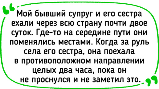 Зимний день. Мне было около 10 лет, папа учил меня водить. Выехали из гаража, проезжаем мимо железнодорожных путей. Папа кричит: «Тормози! Тормози!», а я аккуратно начинаю тормозить. В конце концов он разозлился: «Если я говорю "Тормози", надо жать на педаль сразу! Вдруг там опасность, а ты такая медлительная?!» В итоге он сел за руль сам и чуть не поседел — оказалось, что у машины отказали тормоза. Рассказ отца: «Мы были в гостях, я немного выпил. Мама за рулем — она ездит крайне редко, зрение плохое, в очках, боится всего...