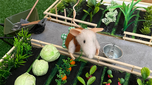 Сегодня с утра Пик занялся кровлей. Вдруг пойдёт дождь, а у их домика ещё нет крыши. И не дождавшись помощника, сам полез на такую высоту. Работал мышонок быстро и ловко. И уже скоро на крыше появилась замечательная черепица. Если вы строите домик вместе с нами, то приглядевшись внимательно, вы поймете, что для крыши и черепицы мы используем обычный картон от коробок, окрашивая его акриловой краской. это просто полоски с надрезами😉. Крыша получается на загляденье! Со сказочной черепицей. А в это время Мила и Мая уже во всю обустраивают свой огород...