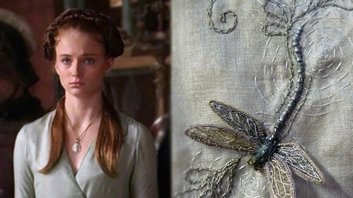 Символизм стрекозы, крыльев и бабочек в образе Сансы: [...] когда рождаются символы стрекозы, крыльев и бабочки Сансы. Вышивка и мотивы животных в «Игре престолов» , особенно у женских персонажей, тонко намекают на эволюцию их сюжета. Мотив «духа животного» Сансы повторяется в её костюме снова и снова по мере развития её персонажа и истории. Существует множество теорий о летающем крылатом существе, символизирующем герб Сансы Старк, – от кольца в виде мотылька до её украшенных платьев. Серсея называет её «голубкой», а крылатые создания традиционно символизируют красоту и хрупкость...