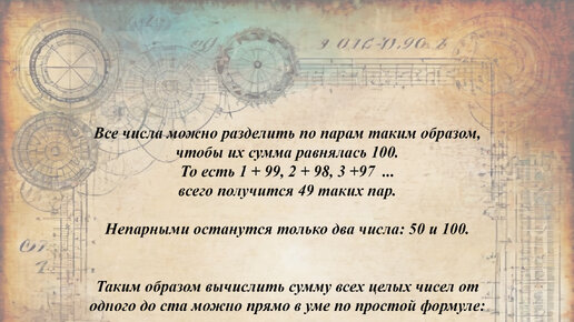 Школьному учителю нужно было разобраться с журналом и он задал детям задачу, чтобы занять их минут на пятнадцать. Он попросил их найти сумму всех натуральных чисел от 1 до 100. Занятие довольно трудоёмкое. Особенно для десятилетних детей в конце XVIII века. Однако буквально через 15 секунд один из учеников поднял руку. Учитель поднял глаза и спросил: — Что, Карл, ты не понял задание? — Нет, я хочу назвать ответ, — ответил мальчик. — И сколько же у тебя получилось? — нехотя спросил учитель. — 5050, — ответил мальчик...