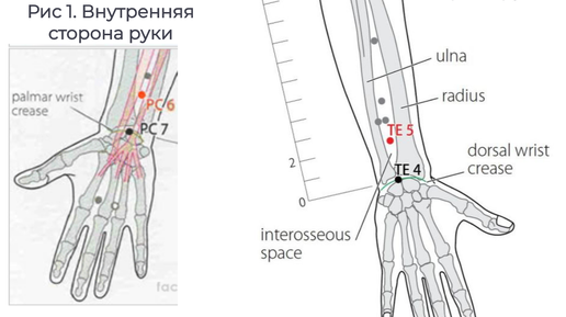 1. Левой рукой обхватите сверху кисть правой руки, поставив палец на точку TЕ 5...
