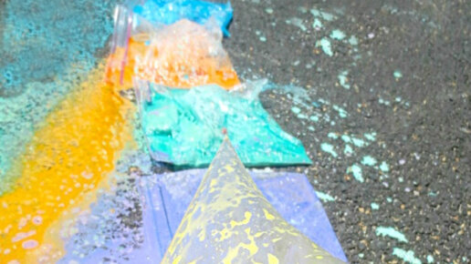 Предлагаю сделать мешочную бомбу с краской. Вам понадобится: Целлофановый пакет с замком - защелкой Zip-Lock; Кукурузный крахмал; Уксус; Пищевая сода; Смешайте 1 стакан кукурузного крахмала с 1 стаканом белого уксуса в большом целлофановом пакете с замком - защелкой Zip-Lock . Смешайте до получения однородной массы, повторяя этот процесс до тех пор, пока не будет подготовлено желаемое количество "мешочных бомб". Добавьте несколько капель пищевого красителя в каждый пакет, прежде чем плотно запечатать их...