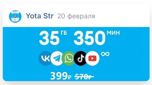 Подключиться на «Тариф на оптимальной скорости» можно до 28.02.2023 включительно. Если вы подключились в указанный срок, то условия будут действовать без ограничения по времени, пока вы сами не решите сменить тариф. Тариф включает в себя 350 минут исходящих звонков на мобильные и городские номера России, 35 Гб интернет трафика и безлимитный доступ к следующим сервисам: YouTube, TikTok, Telegram, VK и WhatsApp (не включает покупку подписок на контент внутри приложений). В тариф включена опция «Оптимальная скорость», которая ограничивает максимальную скорость до 5 Мбит/сек, делая тариф выгоднее...