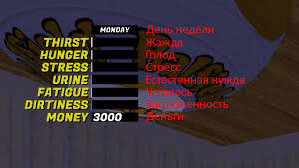Начнем мой гайд с показателей сверху экрана Жажда,голод,усталость - понятное всем,и понятно как их понизит Стресс можно снять разными способами: Рубка дров,курение сигарет,что то пожарить Загряжнение можно снять в душе либо в сауне ДАЛЕЕ РАСММОТРИМ ВАЖНЫЕ МЕСТА Так...