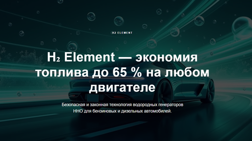 Безопасная и законная технология водородных генераторов для бензиновых и дизельных автомобилей. H2 Element — водородные генераторы для автомобилей: как работает данная технология и почему она реально экономит топливо? Современные автомобили с двигателем внутреннего сгорания тратят до половины топлива впустую. Водородный генератор H2 Element помогает решить эту проблему: он подаёт в двигатель газ HHO — смесь водорода и кислорода, которая делает сгорание топлива более полным и эффективным. Результат — экономия топлива до 65 % и прирост мощности до 30 % без вмешательства в конструкцию двигателя...