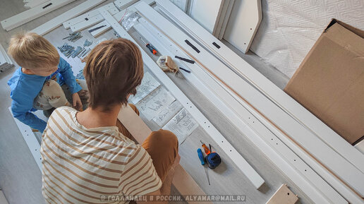 Урааа, успешно! Дети, с моей помощью собрали свою супер-кроватку! Такая красивая двухъярусная, и с небольшой крышей (от дождя прятаться:). Кровать-домик - видно, что дети выбирали. Мы долго её собирали. 3 дня работали по 4-6 часов. Это потому что у моих маленьких начальников мало опыта было, но даже работнику Папе, который с детства уже много кроватей и мебели собирал, было сложно. Папа Махил теперь понимает, что не каждый мебельный магазин - ИКЕА, где есть подробные инструкции даже для сборки ёршика...