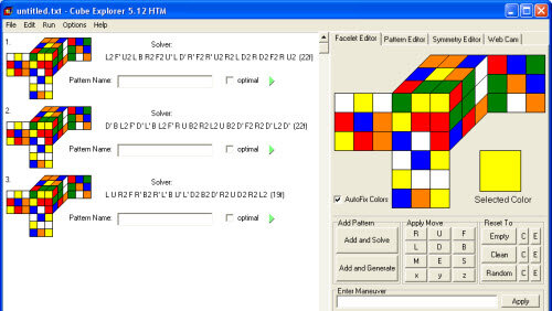 Если Вам лень изучать формулы сборки кубика Рубика, а собрать его все-таки хочется, то такая возможность имеется! В этом Вам поможет программа Cube Explorer 5.12 Герберта Коцембы, вычисляющая пути решения кубика с помощью двухфазного алгоритма. В дистрибутиве находятся два варианта этой программы, предлагающих решения в разных метриках: qtm и htm. В первом случае за один ход принимается поворот грани на 90 градусов, во втором одним ходом считается как поворот одной грани на 90 градусов, так и на 180...