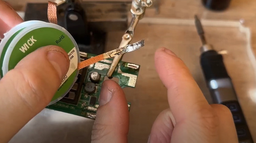 Привет всем, друзья, в своей мастерской я часто паяю, поэтому приходиться использовать хороший паяльник, чтобы процесс был быстрым и качественным. Но убирать припой с платы тоже нужно, для этого я обычно использовал оплетку, которая хорошо впитывает припой в себя. Такая оплетка справляется хорошо со своей задачей, но убирать припой ей не так удобно и при этом у нее большой расход. Вот такую полоску оплетки мне пришлось использовать, порядка 3см, чтобы убрать припой всего с одной контактной дорожки...