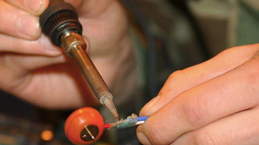 Как соединить очень тонкие провода? Для этого их, не счищая изоляции, скручивают и опускают в ацетон, затем вынимают и осторожно протирают ватой. После этого провода в месте их соединения окунают в расплавленное олово...