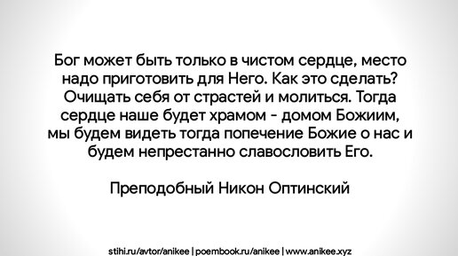 Бог может быть только в чистом сердце, место надо приготовить для Него. Как это сделать? Очищать себя от страстей и молиться. Тогда сердце наше будет храмом - домом Божиим, мы будем видеть тогда попечение Божие о нас и будем непрестанно славословить Его...