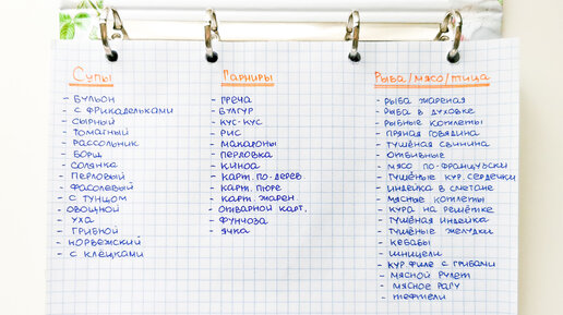 Давно обещанный мною рассказ о составлении меню на неделю. Расскажу и покажу на примере нашей семьи. Но сразу оговорюсь, что меню я составляю не всегда. И при желании всегда могу отступить от тех блюд, что прописала в меню. Итак, как же составить меню на неделю?! Для начала необходимо сесть и выписать все блюда, что ест ваша семья. В итоге, у вас должно получится что-то наподобие как у меня: Ну а дальше всё ещё проще - смотрите, что у вас есть в наличии из продуктов и либо составляете меню, исходя...