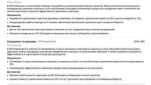 Ищете эффективный пример резюме специалиста в отдел рекламы и хотите понять, как составить документ, который заметят рекрутеры? Изучение готовых примеров — проверенный способ быстро сориентироваться, создать действительно эффективное резюме и приблизиться к работе вашей мечты! 🚀 На этой странице собраны детальные готовые примеры резюме для специалистов по рекламе разного уровня — от начинающих до опытных. Мы предлагаем пошаговые инструкции и полезные советы по каждому разделу, учитывая требования...