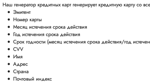 Если хотите протестировать бесплатную пробную подписку сервиса, но натыкаетесь на неприятное обязательное условие. Нужно ввести реквизиты своей личной карты — так вы рискуете, что мошенники снимут деньги. Или вы просто забудете остановить подписку перед первым платежём. На такой случай есть генераторы тестовых кредитных карт. Например, сервис Card Generator. Выбираем любую платёжную систему из семи (таких как Visa и MasterCard), нажимаем на «Generate Card» и получаем фальшивые реквизиты. Сервис рандомно придумывает адрес, номер карты, CVV и другие данные...