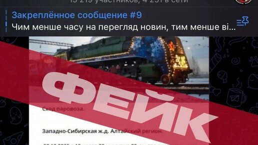 В ночь с 8 на 9 декабря ряд ресурсов в мессенджере Telegram сообщил о якобы сходе Поезда Деда Мороза с рельсов в Алтайском крае. Правоохранители назвали эту информацию украинской провокацией. Как сообщили правоохранители, распространение фейков зафиксировали в тг-каналах, выдающих себя за российские. В сообщениях говорилось, что паровоз, тянущий состав, будто бы сошел с рельсов в Алтайском крае. В действительности же в реальном донесении сообщалось о сходе одного колеса тележки резервного локомотива во время инженерных работ в депо города Барнаула...
