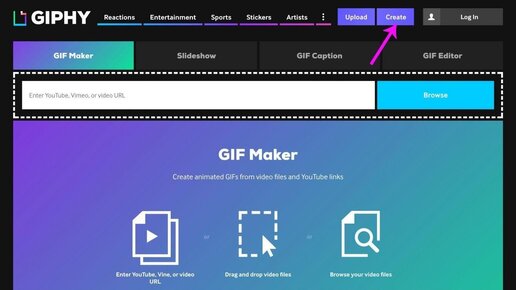 giphy.com/create/gifmaker - на этом сайте вы можете создать любую гифку как по ссылке на видео, так и с видео-файла загруженного с ПК. 1. Зарегистрируйтесь на сайте.