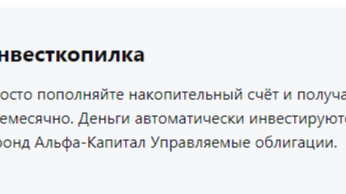 Всё-таки решила попробовать и поэкспериментировать с инвесткопилкой Альфа. Решила действовать следующим образом: ежедневно скидывать мелочь с карты банка. То есть, если на карте в конце дня баланс 143,15 рубля, то 43,15 идут в копилку. И так ежедневно. То есть округляю свой баланс до 100 рублей, чтобы было красиво, а мелочь скидываю в копилку. Альфа-карта у меня для текущих расходов, пользуюсь я ей ежедневно. Если не будет в какой-то день покупок или мелочи не будет на балансе, значит скидывать нечего...