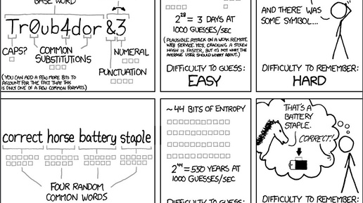 💪😎👍 Если вы не хотите использовать специализированные менеджеры паролей и не знаете как правильно создать надёжный пароль, то эта статья для вас. 😉 📌 Кстати, если вы используете для генерации паролей ИИ — прочтите эту статью. Никогда не используйте ИИ для создания пароля. Это один из самых знаменитых и до сих пор актуальных советов по созданию сильных, но запоминающихся паролей. Он из комикса XKCD №936 "Password Strength" (2012 год), который до сих пор цитируют в 2026-м. Комикс противопоставляет два подхода: 🔹 Традиционный "сложный" пароль типа Tr0ub4dor&3...
