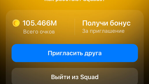 Squad - это твоя собственная команда кликеров. В Игре не предусмотрено(пока), никого преимущества от владения, либо в составе какого-либо сквада. Сквад несет больше фановый характер, где игроки объединяются, создают свое маленькое комьюнити(сообщество). Приглашают друзей, играют вместе и появляется дух соперничества, наблюдая лидерборд (список лучших игроков по заработку монет в лиге). Но нужно отметить создатели сквада, если даже не получают никакого преимущества в виде монет, они могут повысить узнаваемость своего канала, группы и набрать дополнительно подписчиков...
