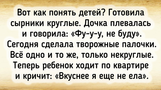 Предпочтения наших детей в еде могут поставить в тупик кого угодно. Поэтому уговорить их съесть хоть что-то — отнюдь не просто. Герои нашей статьи поделились фотографиями и историями, которые подтверждают, что кормежка чада — то еще мероприятие.   Вот как понять детей? Готовила сырники круглые. Дочка плевалась и говорила: «Фу-у-у, не буду». Сегодня сделала творожные палочки. Все одно и то же, только некруглые. Теперь ребенок ходит по квартире и кричит: «Вкуснее я еще не ела». © Ivelios23 / Pikabu   У знакомой 4-летнего ребенка отдали в детский сад...
