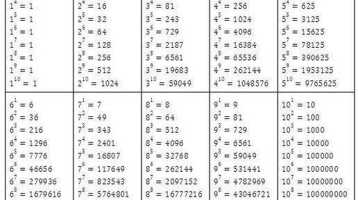 Таблицы натуральных чисел в степенях Таблицы степеней являются важным инструментом в математике, облегчающим работу с числами и их возведением в степень. Они позволяют быстро находить значения чисел в различных степенях, что часто используется при решении задач и в различных математических вычислениях. Пример задачи: Найдите значения числа 2 в степени от 1 до 5. Решение: Традиционная таблица степеней натуральных чисел: от 1 до 10 Традиционная таблица степеней представляет собой перечень чисел в степени от 1 до 10...