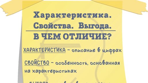 Как быстро понять, в чем разница между ХАРАКТЕРИСТИКОЙ, СВОЙСТВОМ и ВЫГОДОЙ товара или услуги? Часто для описания товара или услуги используются их характеристики, свойства и выгоды. И, судя по опыту, многие путаются в этих определениях. А кто-то считает их если не синонимами, то просто очень близкими словами. Итак: Характеристика – описание товара в цифрах...