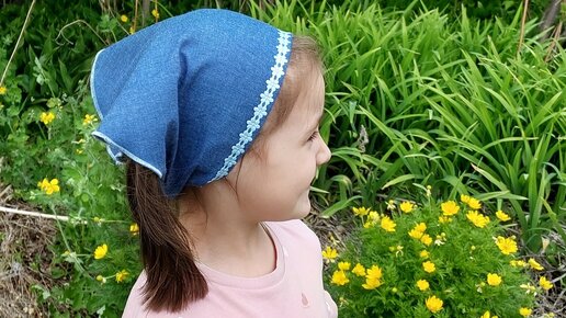 Наступает летняя пора и нам пора сшить для наших девочек косынку-бандану. Шьется она очень просто и быстро, я за сорок минут сшила 2 косынки и успела еще кружку чая выпить))))) Именно этот вариант косыночки мне больше всего понравился, потому что она крепится на резинку и не сползает с головы, для работы я взяла тонкую джинсу, а второй вариант сшила из штапеля. Край у косынки обработала на оверлоке - руликом, но если у Вас нет оверлока, то Вы можете обработать его зигзагом или кружевом. Край украсила декоративной тесьмой...