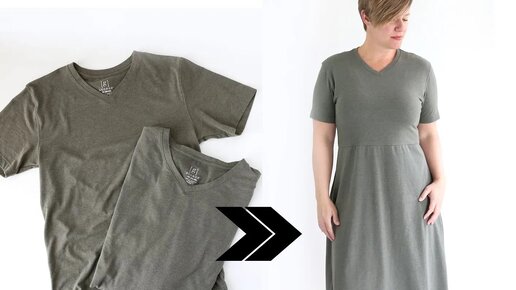 Для этого проекта понадобится две мужские футболки, маленького размера и побольше — после несложных манипуляций из них получается женское платье! Простое, удобное и комфортное повседневное женское платье можно сшить из двух больших футболок — и это не отнимет много времени и сил! Вся самая сложная работа уже сделана: например, обработаны горловина, низ изделия и рукава, да и с раскроем почти не придётся возиться. Тут использованы две мужские футболки, одна размера XS, другая — 3XL. Футболка побольше нужна, чтобы сделать юбку, а из той, что поменьше, получается верхняя часть платья...
