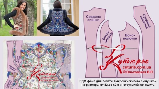 ПДФ файлы для печати на листах любого формата выкроек женского жилета на размеры от 42 до 62 в натуральную величину с инструкцией как сшить этот жилет. Уровень сложности пошива: средний. Данная модель прекрасно подходит для всех типов фигур и комплекций, хорошо смотрится на женщинах всех возрастов. Жилет с опушкой может быть сшит как из павлопосадских платков и палантинов, так и из кожи, жаккарда, плотной джинсы, драпа и др. тканей. Рисунки выкроек своими руками для женского жилета Особенности выкройки жилета своими руками Процесс раскроя очень простой...