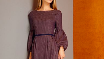 Платье у нас прилегающего силуэта, отрезное по талии. По талии контрастная узкая вставка в виде пояса. По лифу платья есть талиевые вытачки и нагрудные вытачки. Юбочка слегка сужена к низу. От талии вниз заложены 4 небольшие складочки. Рукав втачной. Разделен на две части чуть выше уровня локтя. Нижняя часть рукава расширена и присборена...